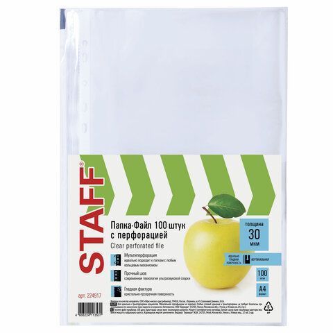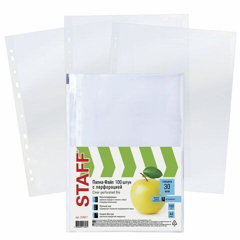 Перфофайлы А4 30 мкм гладкие STAFF 100шт яблоко 1/30 купить оптом и в розницу в Ижевске