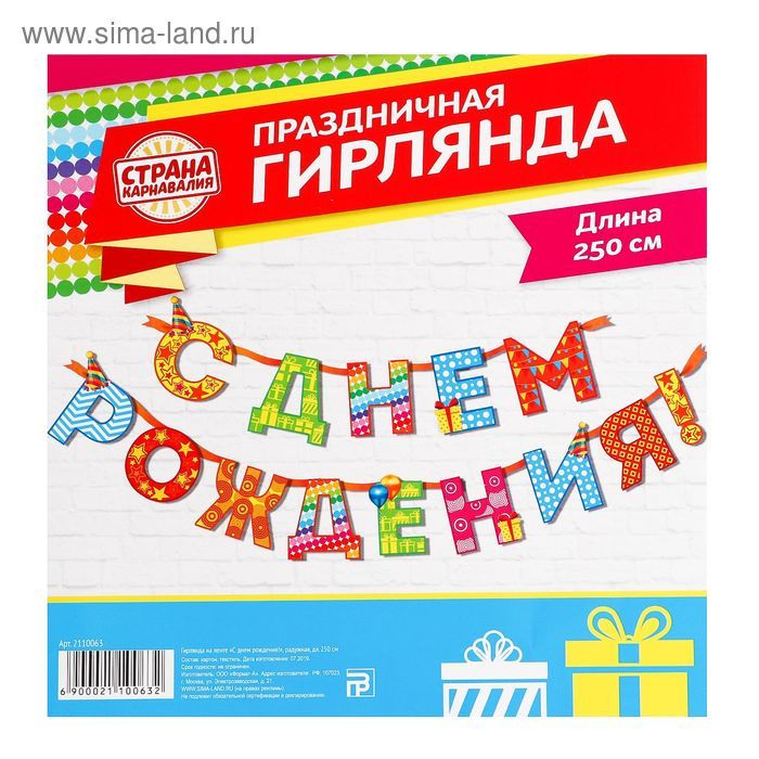 Гирлянды-буквы С Днем рождения, радужная, 250см, 1/250 оптом и в розницу в Ижевске, цены в каталоге с доставкой