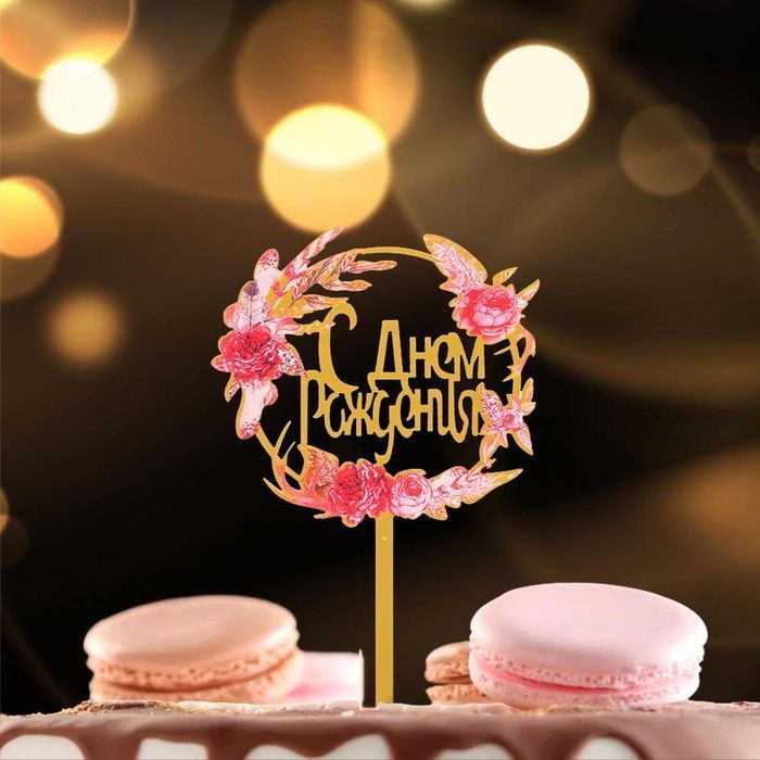 Топпер для торта С днем рождения! золото цветы 1/1 оптом и в розницу в Ижевске, цены в каталоге с доставкой